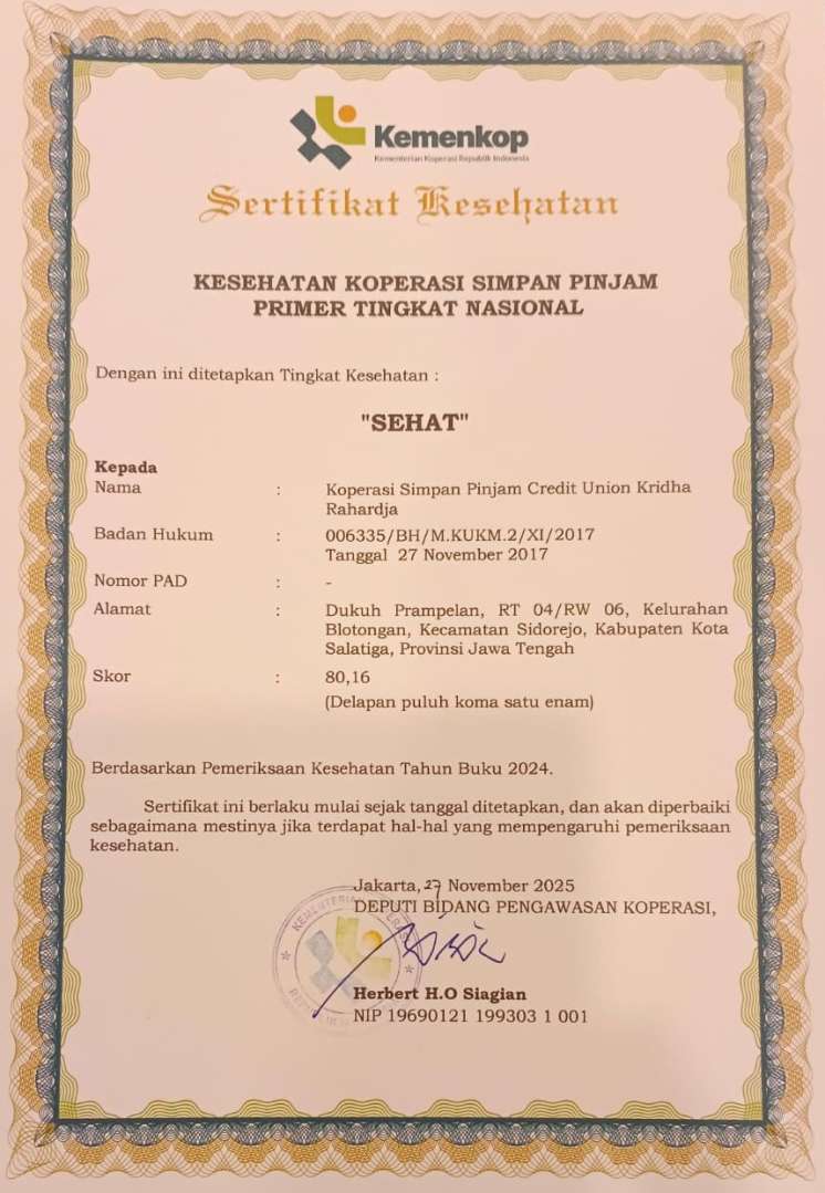 Sertifikat kesehatan koperasi simpan pinjam primer tingkat nasional yang menyatakan bahwa CU Kridha Rahardja itu sehat ditetapkan oleh Deputi Bidang Pengawasan Koperasi Kementerian Koperasi, Herbert H.O Siagian di Jakarta pada 27 November 2025.